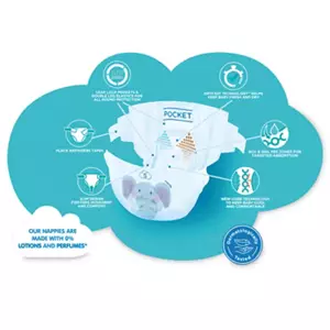 Size 5+ Nappies, 64 pack. Our fastest absorbing nappy ever!!. Boy & Girl Pee Zones for targeted absorption. The same size nappy as the standard size nappy but with extra absorbency. Leak Lock Pockets – Protective pockets front and back to help with leakage & poo explosions. Place anywhere tapes for a speedy change. Up to 12 hours dryness, day & night. Dryfast Technology helps keep baby fresh and dry. Slim design for free movement & comfort.