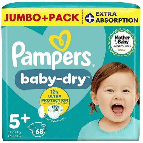 - Pampers Baby-Dry nappies have an extra absorbing layer to absorb wetness quickly for up to 12 hours of dry and protected skin