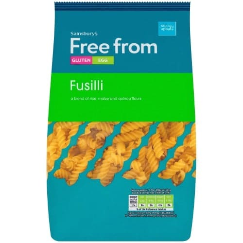 - Dried fusilli pasta made from rice, maize and quinoa flours