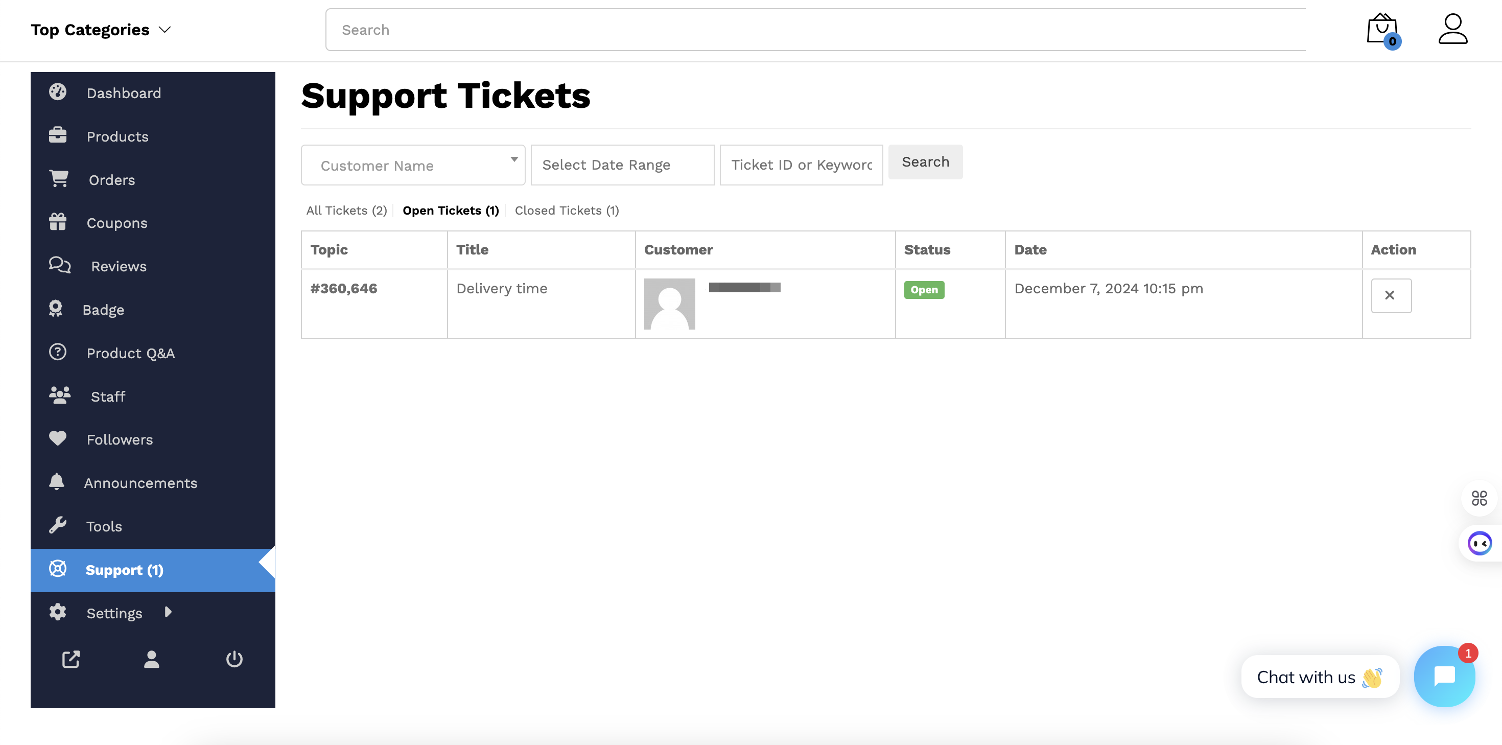 The Store Support feature allows you to efficiently manage customer queries and concerns through support tickets. Customers can reach out to you for assistance, and you can handle these requests directly from your dashboard.